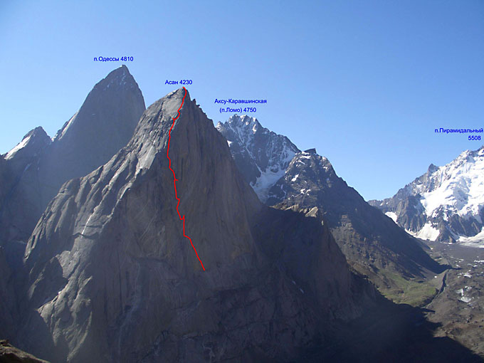 Спуск по СВ гребню до небольшой седловинки. От седловинки 10 дюльферов по Северной стене до плеча в.Асан. От плеча 6 дюльферов на юго-восток в цирк п.Одессы(4810).
