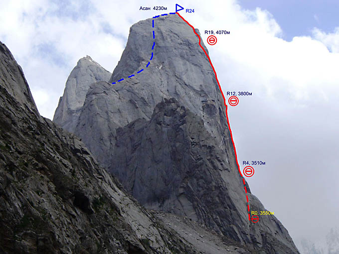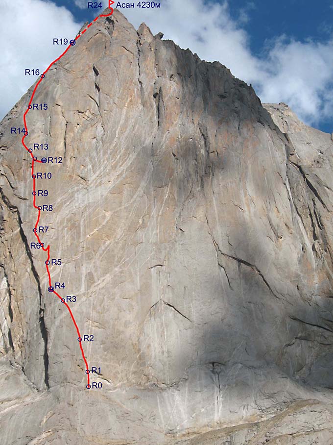 R 0- R 4: По системе каминов и внутренних углов, расположенных в правой части характерного контрфорса «огурца» подъем свободным лазанием. Лазание сложное, объемное, много лазания в распор. Страховка надежная, френды, стоппера больших и средних размеров. На вершине огурца полка для ночевки. На всем «огурце» воды нет. Контрольный тур №1.