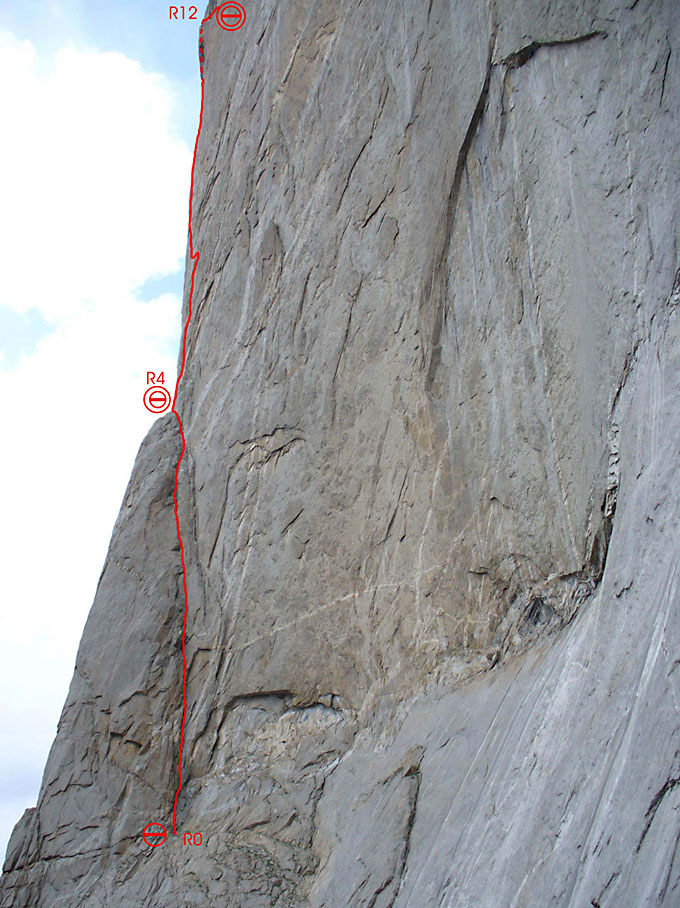 R 4- R 11: Ключевой участок маршрута. 260 метров почти вертикальной стены. Сначала сложное лазание (до 6с) по вертикальному внутреннему углу. Маятник влево, ИТО по стационарным шлямбурам через два небольших карниза до большой вертикальной плиты с единственной щелью. По щели вверх, немного вправо ИТО до А2 на стопперах и мелких френдах до шлямбурной станции. В середине щель сильно сужается и немного нависает. Мелкие стоппера «семечки» и якорные крючья. Дальше сложный траверс влево и сложным лазанием вперемешку с ИТО до полки «балкона». На правой части «балкона» (R12) ночевка и контрольный тур №2. На этой части стены воды нет.