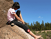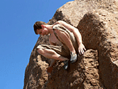 В воскресенье в 9.00 мы пошли, о счастье!!!, лазать трудность! Размялись с Пашкой на 6с и 6с, полезли новый Серегин проект, Звездопад 7б. Потом стало неслабо припекать и все пошли купаться и кушать. Костян нырял с сосны, высота метров 15, вообще абзац, «скажи страху нет!». После обеда вернулись, и я залезла НОС.