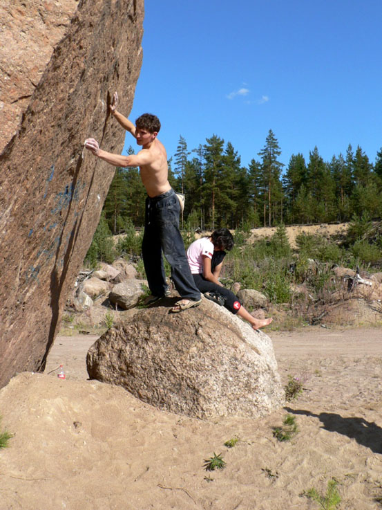 И поехали дальше... в направлении Выборга на СТАЛКЕР. Район перспективный, много камней, трасс получится много, причем разнообразных: и нависание и вертикаль, и ручки и мизера, к тому же камни расположены близко друг от друга, стоят на песке. В этом районе мы опробовали Правый дубль, до Левого не добрались.