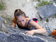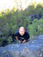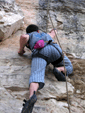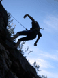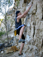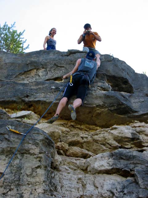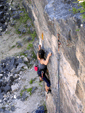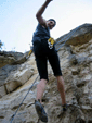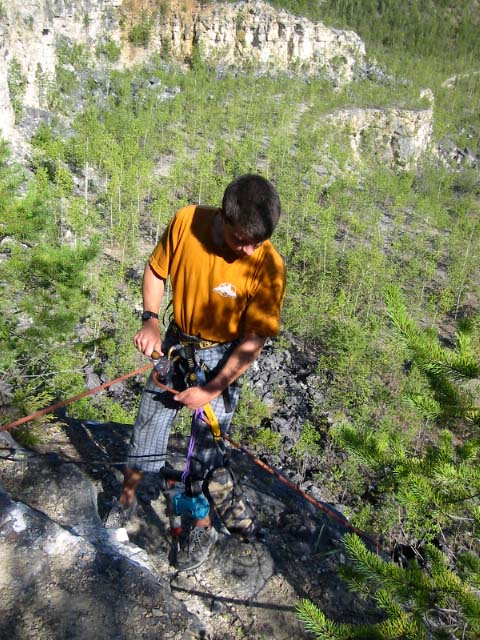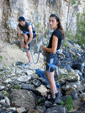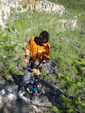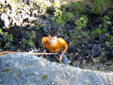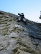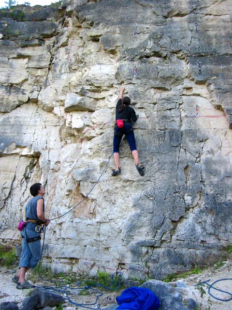 Итак, с чего начинать бить маршрут? Видимо, сначала надо найти подходящее место и опробовать его собой. Я спустилась вниз и пошла вдоль стены с видом профессора по пробиванию маршрутов. Мне приглянулись три места, два из них находились рядом, там-то мы и провесили верхнюю страховку для опробования. Далее в течение битого часа мы с Britt'ом мусолили эти два маршрута, по ходу дела отламывая половину плохо державшихся зацепок и продумывая возможные ограничения. Правый маршрут был чуть сложнее, но бить крючья в нем не представлялось возможным - камень был слишком рыхлым. В результате было принято компромисное решение - повесить базу над правым маршрутом, что позволило бы ходить его с верхней страховкой, а шлямбура пробить по левому с уходом вправо, к базе, на уровне предпоследней оттяжки. На этом свою миссию мы посчитали выполненной и передали дело в надежные Сережины руки, с чистым сердцем отправившись лазать.