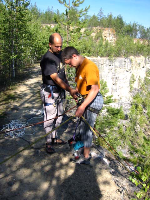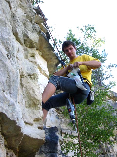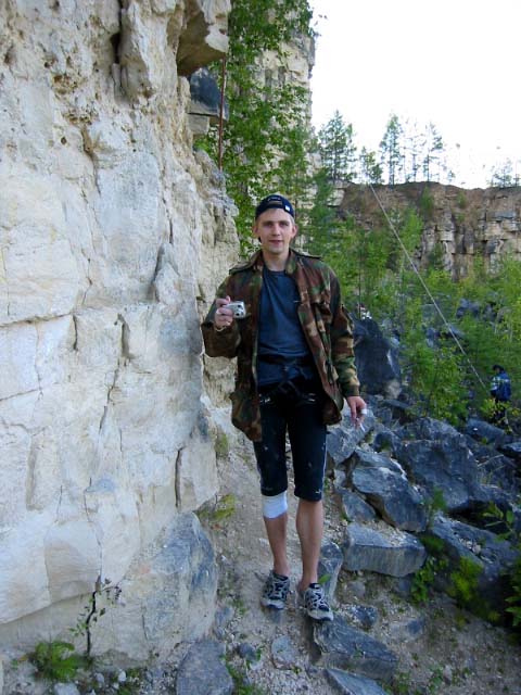 Примерно в это время в карьере появился новый персонаж, широко известный в узких альпинистких кругах, а именно Олег Миленин, автор большинства маршрутов Владимирского карьера. Придуманный нами маршрут был одобрен:) и Сережа с чистым сердцем приступил к претворению его в жизнь. Перво-наперво была прикручена станция. Далее Sanek, как опытный альпинист, еще раз пролез маршрут и крестиками наметил места пробивания шлямбуров. Далее ребята что-то долго сверлили, пробивали, завинчивали, я, как обычно, успела остыть к процессу, показавшемуся мне излишне долгим... Потом не хватило одного анкера и мы мотались за ним во Владимир, но так и не купили. Недостающий анкер дал нам Олег. В итоге, о чудо, маршрут был готов! Обстоятельный Sanek потратил еще час работы с зубилом, в итоге внизу красовалось название маршрута - «Анчутка». Название было придумано нами заблаговременно, это был подарок на день рождения (с днем рождения, Анчутка!:)