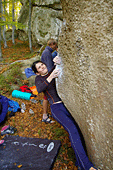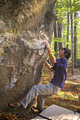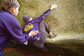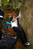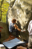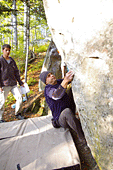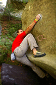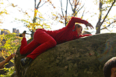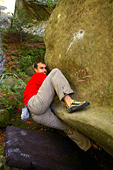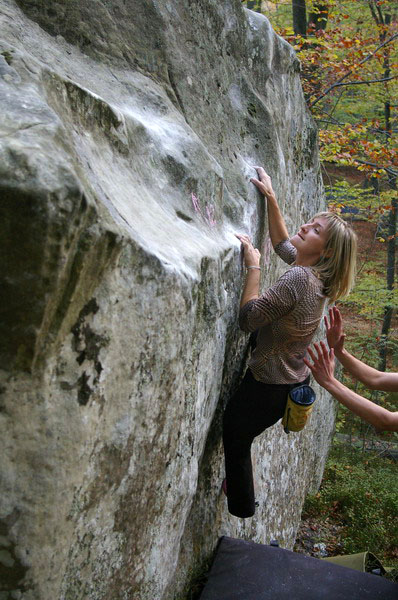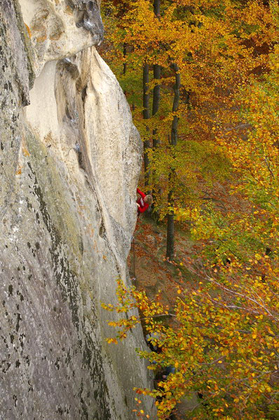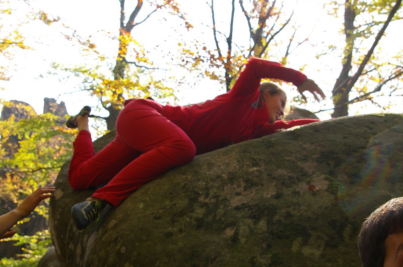 Лазание… Сами блоки из песчаника, все такие «пассивные», так что любителям Лыткаринского «Пузодера» туда прямая дорога – впечатлений будет море! Впрочем и лазания, например, по дыркам там хватает с избытком. Песчаник сыпется, но в целом не сильно – хотя железными щетками там лучше не пользоваться, обычных, зубных хватит с избытком. Лазание просто обалденное – словами его описывать, все равно что рассказывать про музыку на пальцах. В общем, ехать туда определенно стоит – в одном месте собранно довольно много боулдеринговых проблем и обычных, пробитых трасс (есть даже один мультипитч из двух веревок), причем все это совершенно рядом – делаешь шаг от скалы и натыкаешься на боулдеринг. Супер!