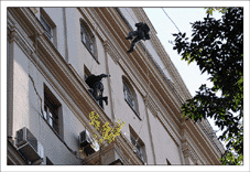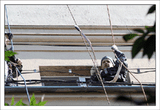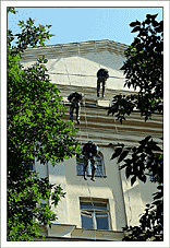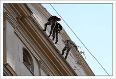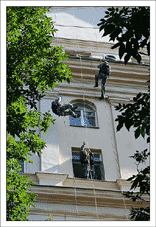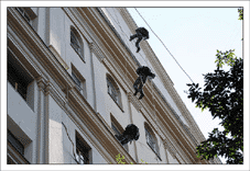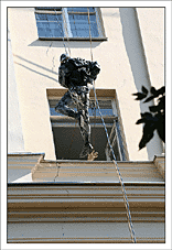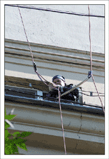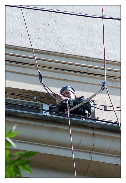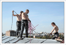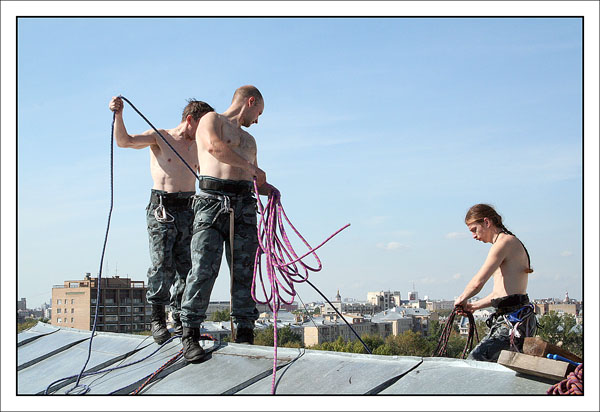 После этого нужно взять очень много веревок, и навязать из них то, на чем доблестные организмы будут влетать в окно несколькими этажами ниже (в нашем случае это около 300-400 метров веревок). Не стоит отвлекаться на превосходные виды с крыши – мы на работе, нас ждут великие дела.