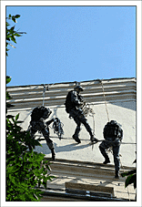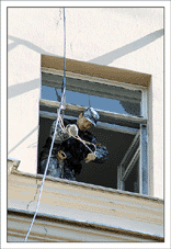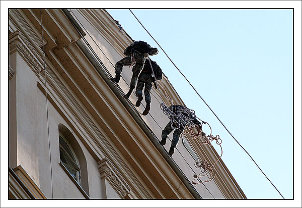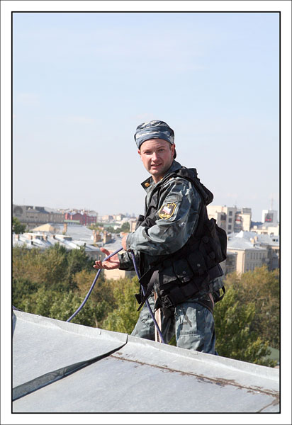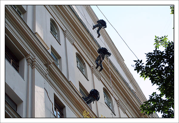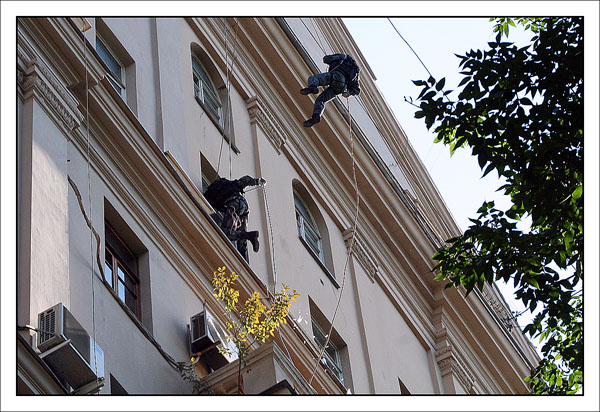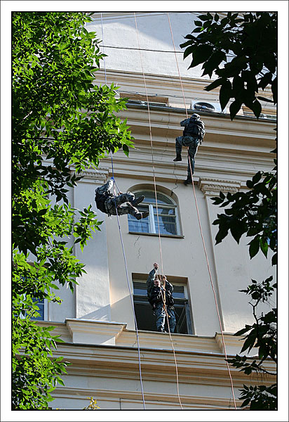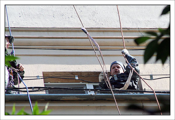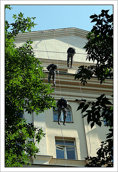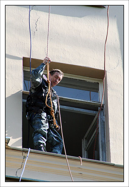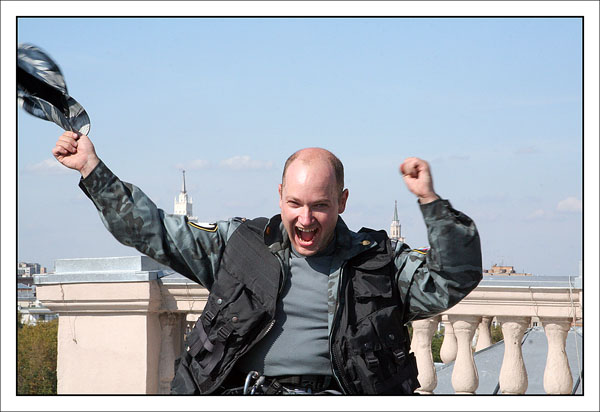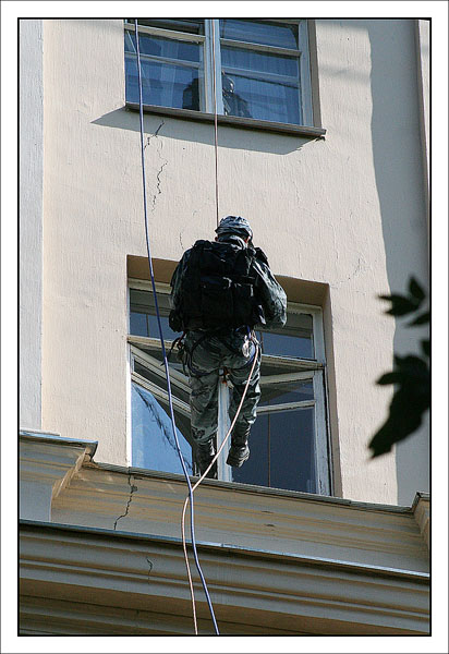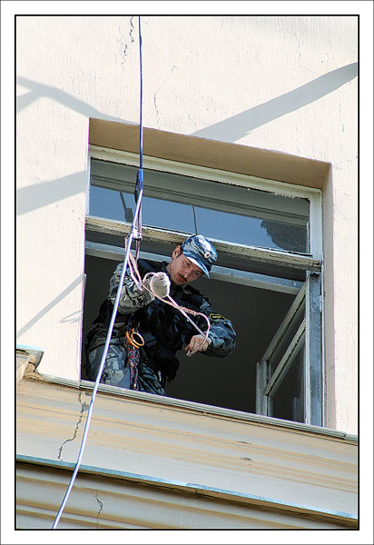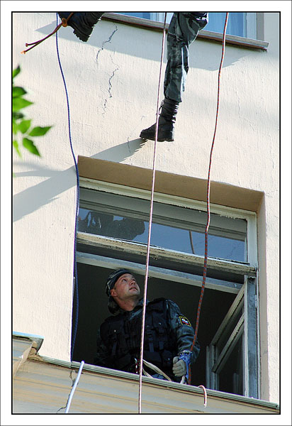 От редакции: выше описано, как Конхо и Серега Веденин под руководством НикВаса работали каскадерами, изображая из себя группу захвата, для чего предварительно, стирая себе руки в кровь и наращивая бицепсы, учились в ДДСе скоростному дюльферу и вышибанию бетонной стены, изображающей из себя окно:) |