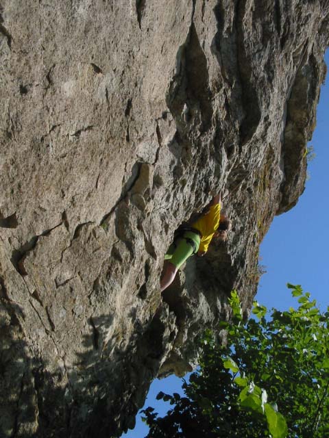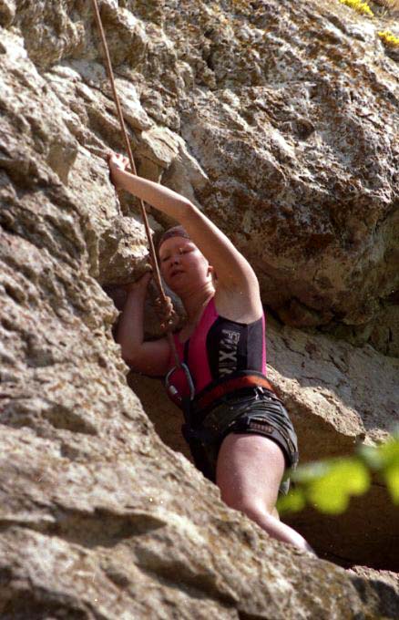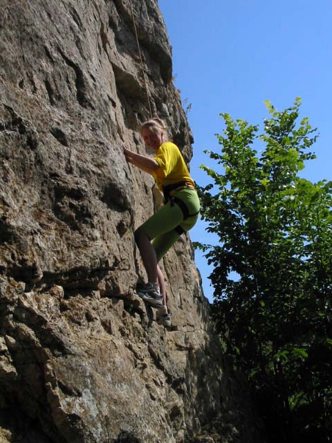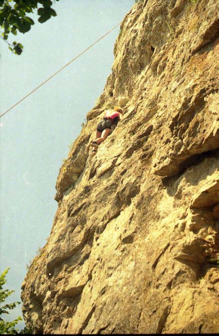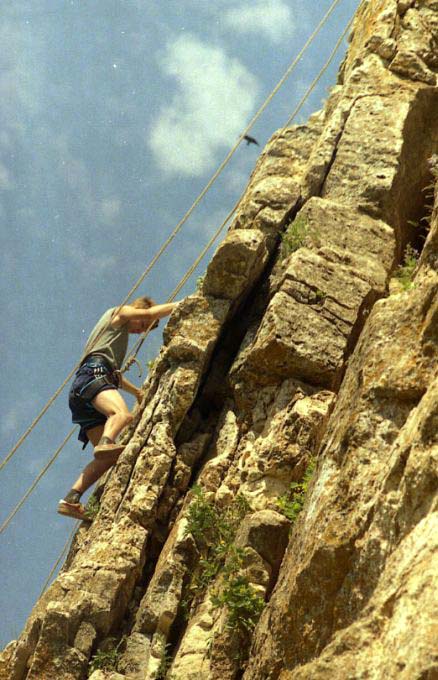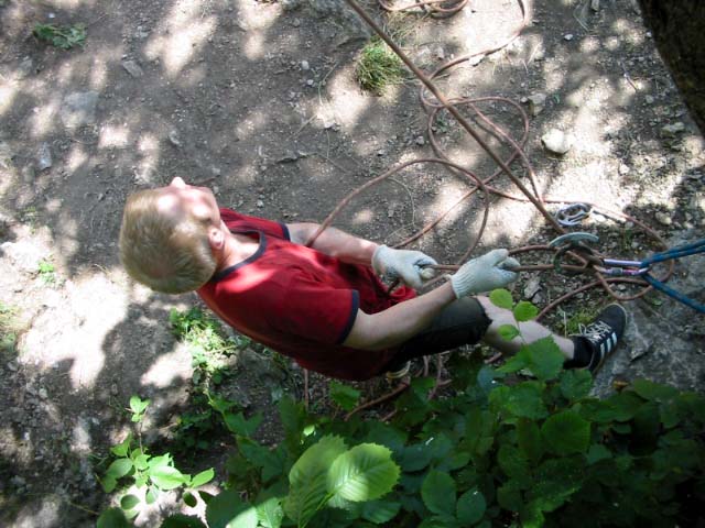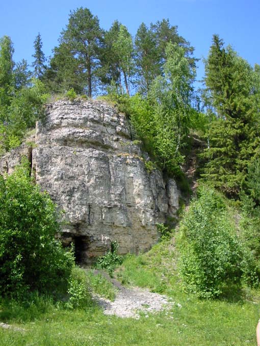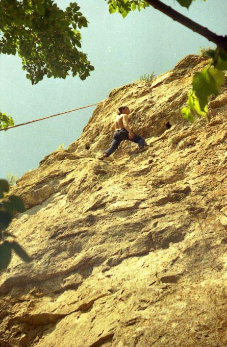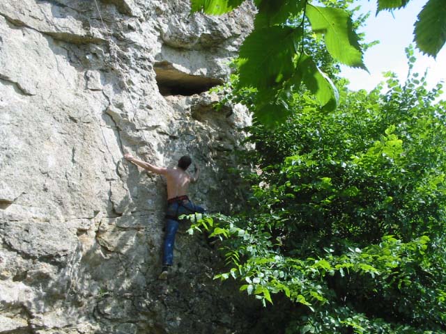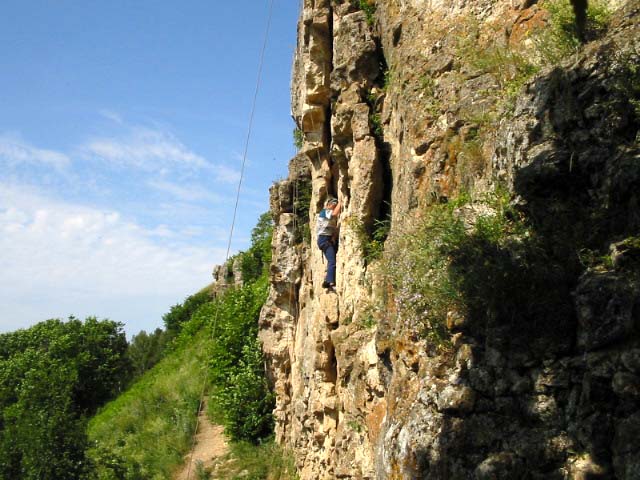 При нас лазали там все с верхней страховкой, хотя многие дорожки были пробиты. Может у других, как и у нас, не было просто оттяжек. На маршрутах абсолютно нет живых камней. Лазать очень понравилось, высота от основания метров 12-15, а над рекой метров 30-40. Лазали мы простой дорожке, нам ее посоветовали как для начинающих. Массив большой, длина скальных выходов метров 500, но это место было самое удобное для страхующих. Потом мы отправились в пещеру Киров-600, она была рядом в лесу. Я туда пролезть не смог, и просто побоялся, в у входа очень тяжелый лаз. После мы снова заехали на водопад, попробовали спуститься с утеса на восьмерке и забравшись в другую восьмерку помчались в сторону домой.