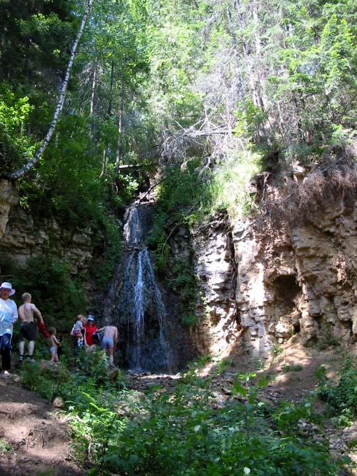 деревни, там местных спросили, они сказали, что бы добраться до скал надо ехать до конца деревни, а дальше мастерская, и к речке, почти до самой мастерской твердое покрытие, а ближе к речке грунтовка, и после дождя я вряд ли бы проехал. Выехав на речку, мы свернули направо. Берега с обоих сторон высокие, покрытые хвойным лесом, как будто мы очутились в горах, одним словом, атмосфера сменилась. На нашем пути встретился водопад. Проехав еще метров 400, выехали на поляну со скалой (Буржатский утес). Скала хоть на вид красивая, но лазать по ней нельзя, сильно крошится. Есть риск обрушить на страхующего кучу камней. Прогулялись до водопада, каждый принял освежающий "душ". Следом подъехал пазик, набитый пьяными людьми, вся толпа пошла принимать душ.