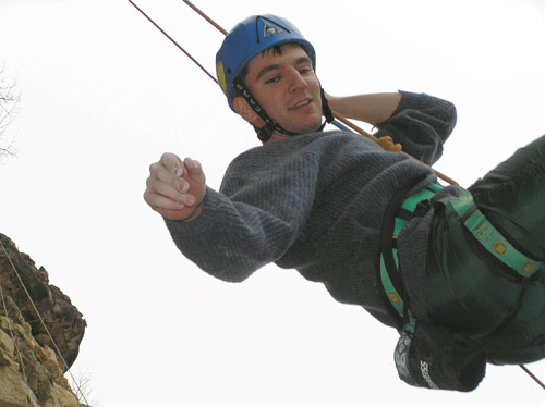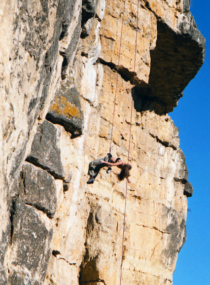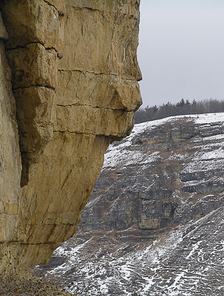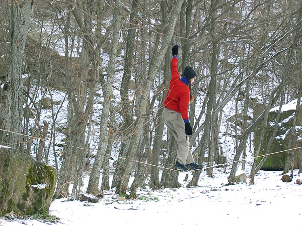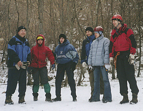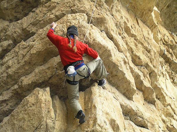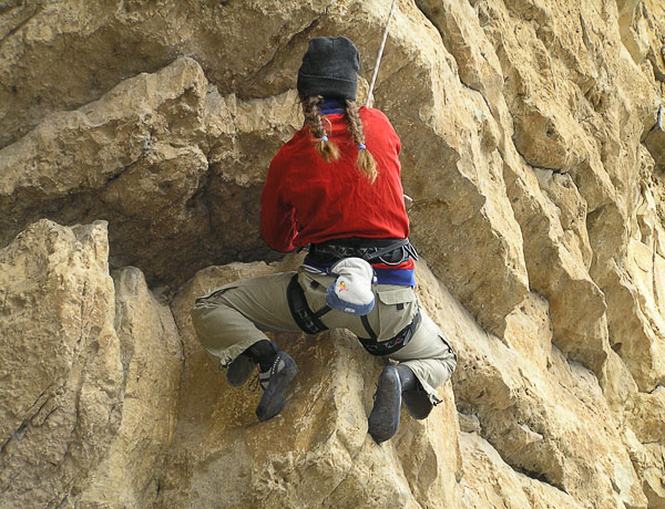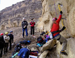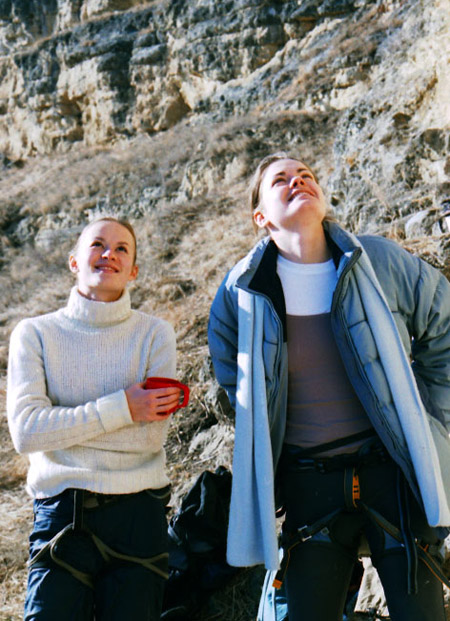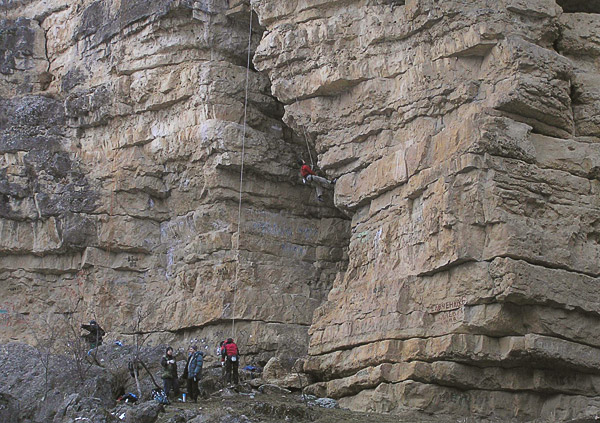 Остренькая (как её еще ласково называют) с одной стороны на самом деле совсем не острая, а пологая, поросшая лесом, с другой же стороны она представляет собой более чем 100-метровую скальную стену. Помимо скалолазных дорожек по этой стене, а также по гребню идет более 15 альпинистских маршрутов (среди которых, опять же, большинство - Юрины). На один такой маршрут «чтобы разогреться перед лазанием» отправились наши сильные духом товарищи — Индеец, Шульц, Саша и Вика с Машей. Руководителем, естественно - Юра. Им предстояло покорить маршрут 2a, что в зимних условиях можно считать весьма серьезным мероприятием. Вооружившись самострахами, жумарами и касками ребята (при чем большинство – впервые!) пошли на гору. Еще одна связка, уже опытных альпинистов — Андрея и Шурика — уходила вообще на крутой бигволл по 50-метровому нависанию.