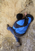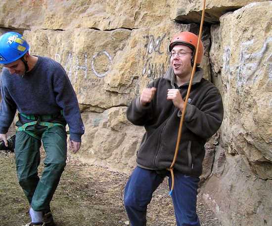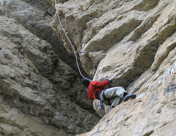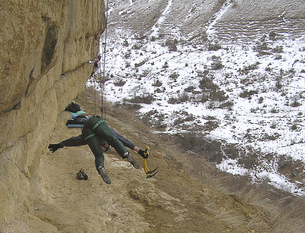 На покорение нависания, со скрипом заставив себя вытащить руки из трех пар рукавиц, а ноги – из трех пар носок и новеньких Asolo, устремляюсь я. Преодолев метра 4 наскальных росписей (воистину, скалолазание начинается там, где кончаются граффити), начинаю тупить под карнизами – никакие скручивания и понтовые закидывания пяток не помогают, я постоянно срываюсь и позорно висю, представляя собой легкую мишень для троих скучающих внизу папараццев.