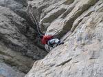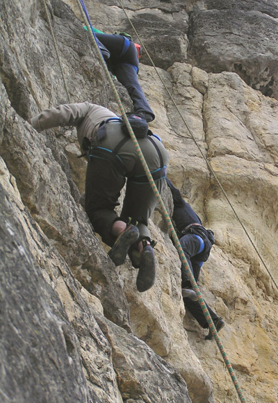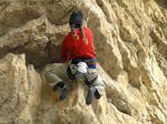 Теперь я смело могу заявить: тот день был единственным реальным днем лазания за все время нашей поездки. Солнце жарило практически как летом, скалы наконец-то прогрелись. Мы славно полазили и подрайтулили. Даже Индеец, после того, как я «почистила» трассу 6с от лишних зацепок и с помощью тяпок превратила ее в 7а, сподобился расчехлить тапки и полазить с нами. Он же героически (а про себя, наверное, – матерясь :)) снимал лазанием вниз на 6а(-б) оттяжки, щедро развешенные нами с Шульцем метров на 7 выше спускового кольца (мы думали там будет еще одно… Вообще, завершая это повествование, хочется сказать Димке огромное спасибо за