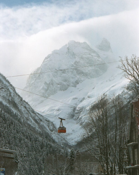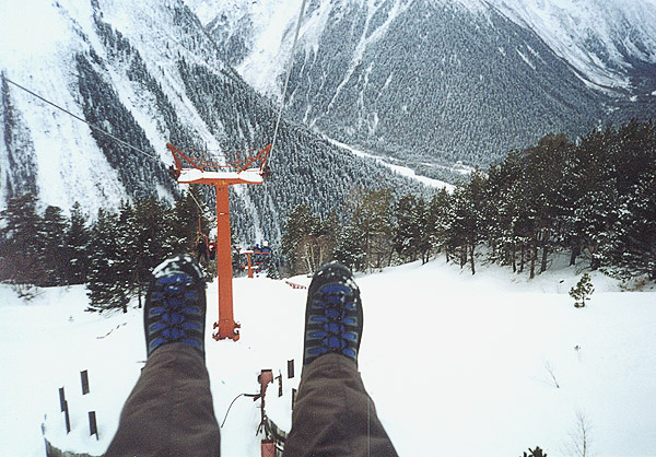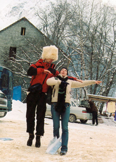 Следующий день решением ЮНЕСКО был объявлен днем отдыха от лазания — мы собирались на весь день на Домбай. Очередная ночная пьянка закончилась где-то в 4, в 6 нас уже ждал автобус. Мы плюхнулись на сидения с единственной мыслью — выспаться в дороге. НО не тут-то было! Наш гид-благодетель Эдуард заготовил для нас потрясающе интересную лекцию, которая длилась ровно всю дорогу до Домбая — т.е. на протяжении 3-4 часов! Те, кому было совсем тяжело, уснули сразу под убаюкивающий голос лектора. Те, кто еще мог держаться, почерпнули массу ценной познавательной информации о