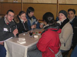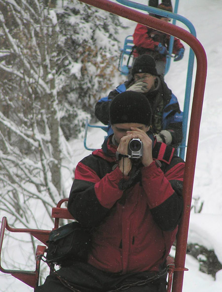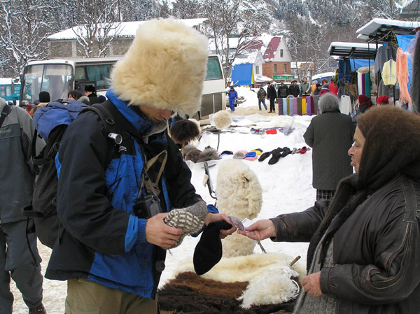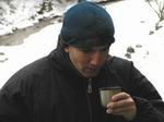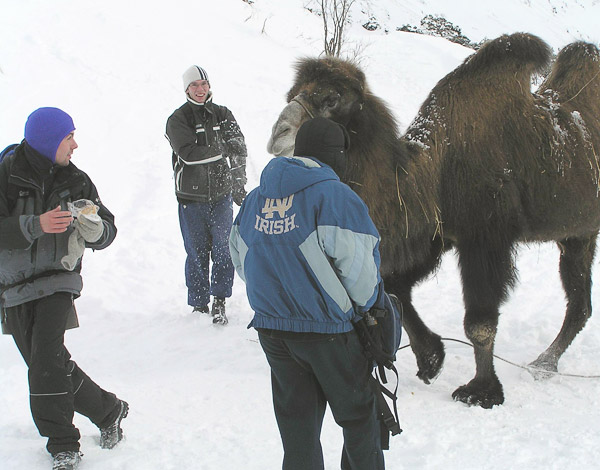 Первое, что мы сделали по приезду — отправились в кафешку. Наконец-то, на завтрак у нас были не каша с капустой, а настоящие кавказские хычины, шурпа, глинтвейн. Далее следовал культурный отдых: канатка, распитие согревающих напитков, очумелое фотографирование всего и вся, закупка сувениров (например, модной болдеринговой шапочки :)), построение наполеоновских планов на лето (типа - залезть туда, туда и вот еще туда). Ребята представили общественности смертельный цирковой номер - приручение дикого необузданного домбайского верблюда. Это была практически коррида, тореадор Дима (Представитель) даже был покусан животным за локоть, но, слава богу, не сильно :) Короче: было весело, не верите - смотрите сами: