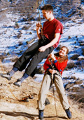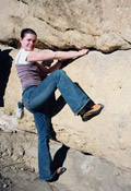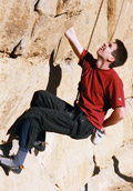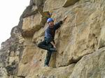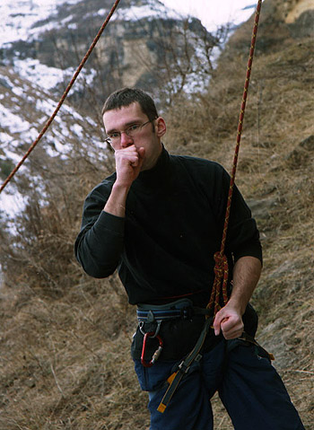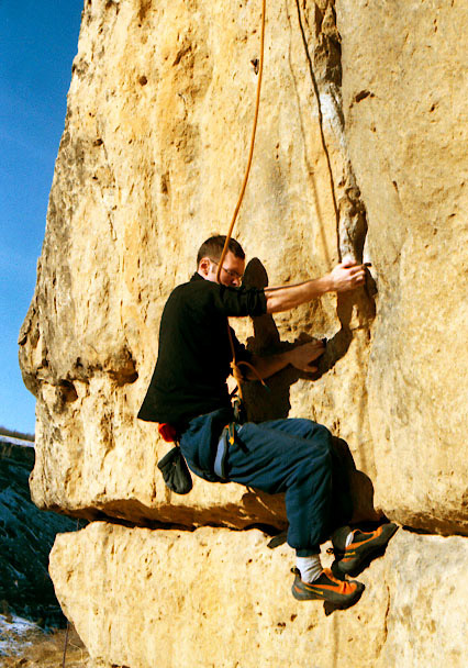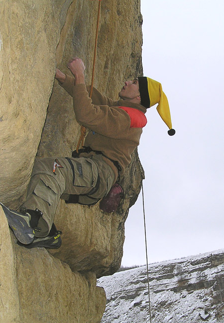 Неприхотливая скалолазная душа радовалась живому камню, но руки предательски отказывались что-либо держать на таком собачьем холод-д-д-де!!! Сыпал редкий мелкий снежок, в блеклом небе что-то мутно светило, зубы стучали, из носов текло — НО ЛЮДИ ЛЕЗЛИ! Одно слово - хроники... :) Такого энтузиазма, скажу вам по секрету, не видывали даже Никиты на майские! В задубевшие от холода скальники ноги можно было засунуть только под дулом пистолета, руки после снятия трех пар перчаток сначала были ватно-немыми, казалось, - вот еще две минуты на скале — и ты получишь все радости обморожения 3-й степени. Но нет, после ~10 метров они разогревались и начинали бешено гореть, как облитые