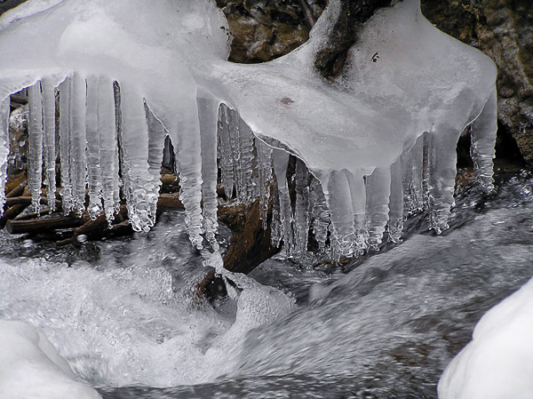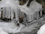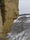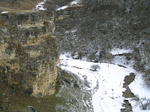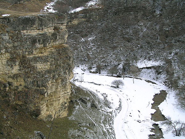скальный массив на южной стороне, полузамерзшая речка внизу и безрадостно