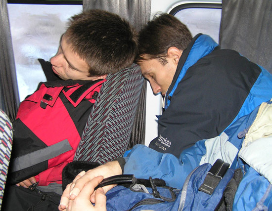 Народная мудрость «не бери с собой в поход книжек» и в этот раз оказалась верна: свежеотпечатанный исподтишка на работе "Performance Rock Climbing” так и проездил всю дорогу невостребованным, зато пропитался целебным горным воздухом и впоследствии был вручен в дар Индейцу для совершенствования спортивного мастерства. Не подвела и другая народная примета – «если едешь в поезде более, чем один – неминуемо надерешься!» Буквально, едва сел в поезд, швырнул рюкзак, - и немедленно выпил :) Начали с шампанского — «за отъезд», потом хлопнули винца, и понеслось… С дальних, затерянных в составе вагонов приходили наши рассеянные по поезду братья и ПРИНОСИЛИ Заодно, так, в душевной атмосфере и перезнакомились. Так вот, разрешите,