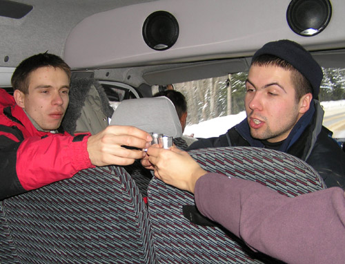 Вернулись наши герои уже в сумерках, полные впечатлений и восторгов; новички получили посвящение в альпинисты и, естественно – немедленно выпили :) Оставшееся допили в дороге, потом продолжили в Погребке. Закончили, как обычно, – в номере, часа в 4 утра, завороженные удивительно красивым пением Маши под гитару….