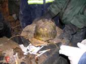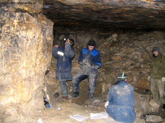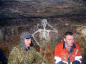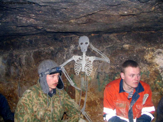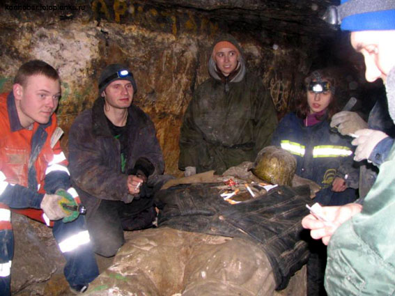 В общем, рассказывать еще можно долго, там есть что посмотреть. Из местных достопримечательностей пожалуй еще скажу про Аристарха (см. фото с каской). Это местный дух подземелий, каждый мимо проходящий оставляет ему кто сигарету, кто монетку… Говорят, первоначально там лежал достаточно древний скелет, но потом его растащили разные телевизионщики и журналисты на сувениры. Зато в штреках нашли мертвого бомжа (залез, заблудился, умер), которым заменили скелет. Не знаю, что правда, а что нет, но череп и отдельные кости наличествуют, я проверил :).