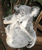 Погуляв по лесу, вернулся к Майку, который ждал в автобусе с толпой народа, возвращавшихся из о'рейлльской гостиницы после тура с ночевой. На обратном пути ехали через лес, где должны были водиться дикие коалы. Майк сказал, чтоб смотрели на деревья. Увидев что-то пушистое и ушастое, я крикнул Майку. Тот не замедлил тормознуть. Все вышли из автобуса. На эвкалипте сидела коала и смотрела на нас грустными глазами.