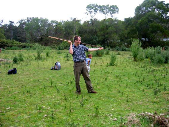 Потом мы пошли кидать копья и бумеранги. Копье кидается с помошью копьеметалки под названием вумера. Индейцы называли ее атль-атль. Ее задача – не чтоб копье дальше летело, а чтоб с большей силой. Наконечников у аборигенов не было. Копья – просто заостренные палки. Чтобы вонзить такую в кенгуру или другого аборигена, нужна изрядная сила. Поэтому пользовались вумерой.