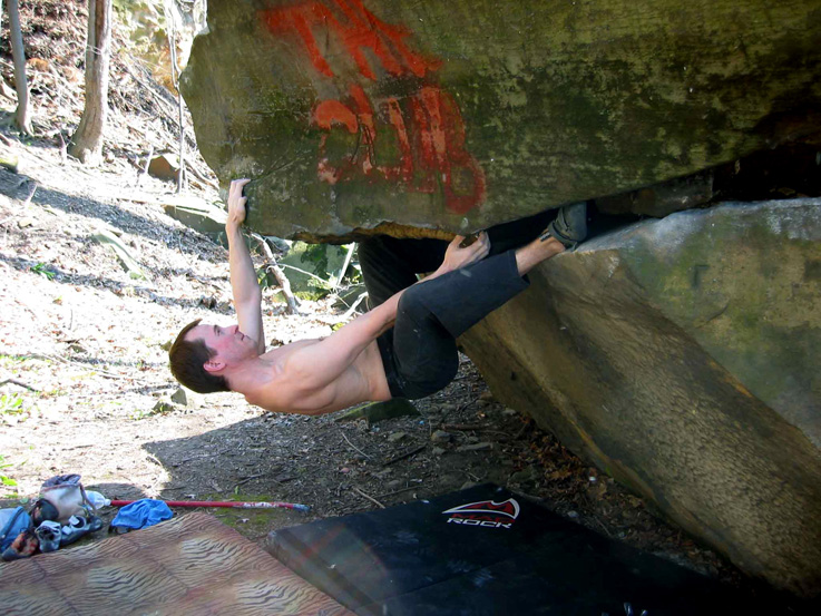 Под проблемами много острых камней. Лазать страшновато. Сами проблемы очень даже ничего. Мы с Беном начали с самых простых, потом перешли на посложнее. Понравилась одна безымянная (на фото). V2-3. Из-под крыши длинное движение на кримп, потом переводишь ноги и делаешь рывок на слоперный край. После чего выбираешься наверх.
