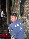 За день до отъезда зашл на скалодром, чтобы попрактиковаться встегиваться. Надо же как простейшая трасса для верхней страховки усложняется, когда лезешь ее с нижней. Наверное, от страха слишком сильно сжимаю зацепки и быстро устаю. Залез наверх, встал на самостраховку, а потом чего-то запутался что куда продергивать. Спас мне жизнь Крис Аллен. Он залез по лесенке с обратной стороны щитов наверх и все шаг за шагом объяснил. Мне было ужасно стыдно, но хорошо, что это случилось на скалодроме, а не на 30-метровой высоте в Ущелье.