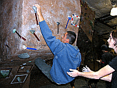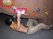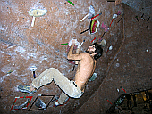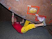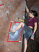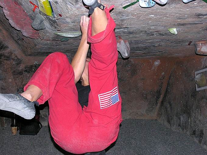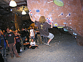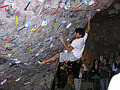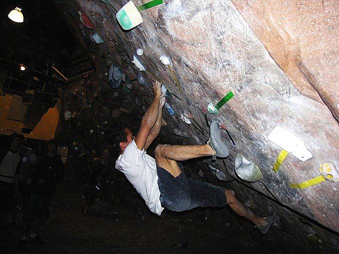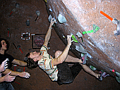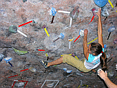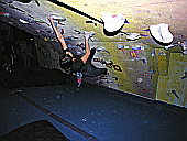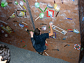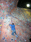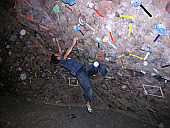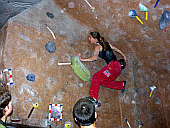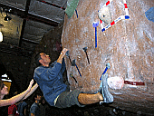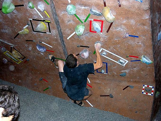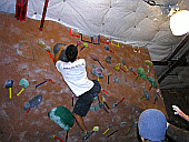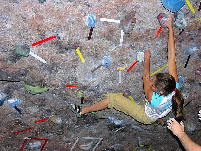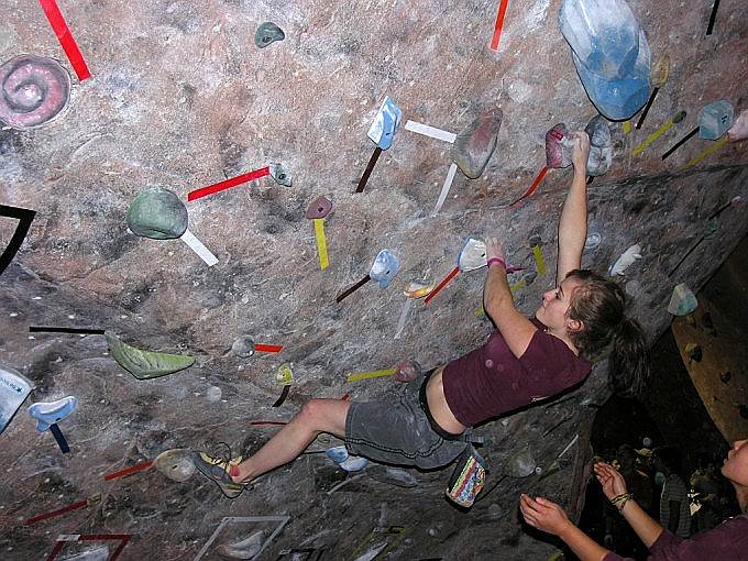 Скалодром – большой, болдеринговая часть приблизительно как 2,5 наших МАЁвника, плюс стенки для лазания с верёвкой. Геометрия разнообразная, ну конечно, чего тут скажешь, когда столько места, зато потолков мало. На потолках вентиляторы, камеры и всякие осветительные прибамбасы висят. Поэтому все трассы вверху заканчиваются как у нас в Бауманке краем последнего щита – очень удобно :-). Но если ты (А-а-а!!!) таки падаешь, внизу – галька и страховщик, я не неженка, блин, но больно же :-). Так, что ещё? Ах, ну и, конечно, большое разнообразие зацепок. Мне понравились те, что наполовину - шершавые, а наполовину - скользкие, у нас я таких не видела, разве что некоторый рельеф в Бауманке :-).