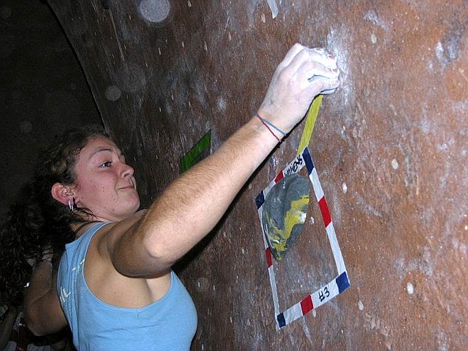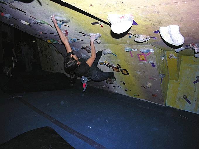 За каждую попытку со стоимости трассы снимали по одному очку, причем максимальное число попыток – 5. Трассы интересные, но в основном силовые, я залезла одну трассу (стоимостью 675) с первой попытки, потом слезаю, а мне ее не засчитали, сказали ноги ставила на зацепку, которая только для рук :-( , ну полезла без неё – не достаю – пришлось напрячься :-), потом оказалось что зацепка была :-) , а трассу из девчонок так никто и не залез!!!