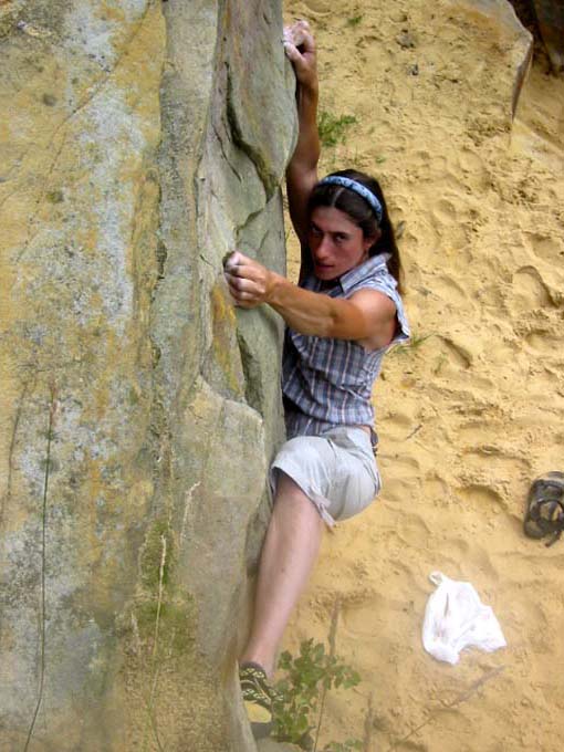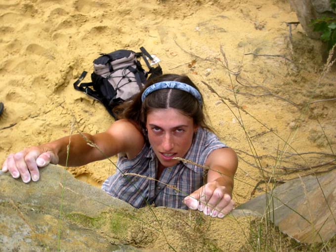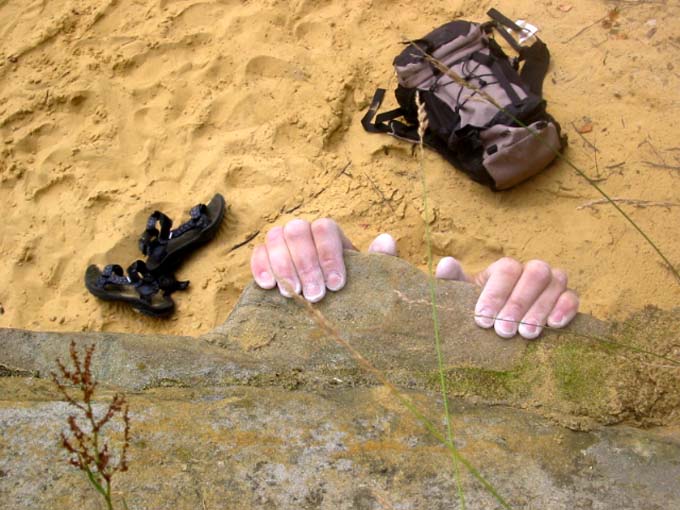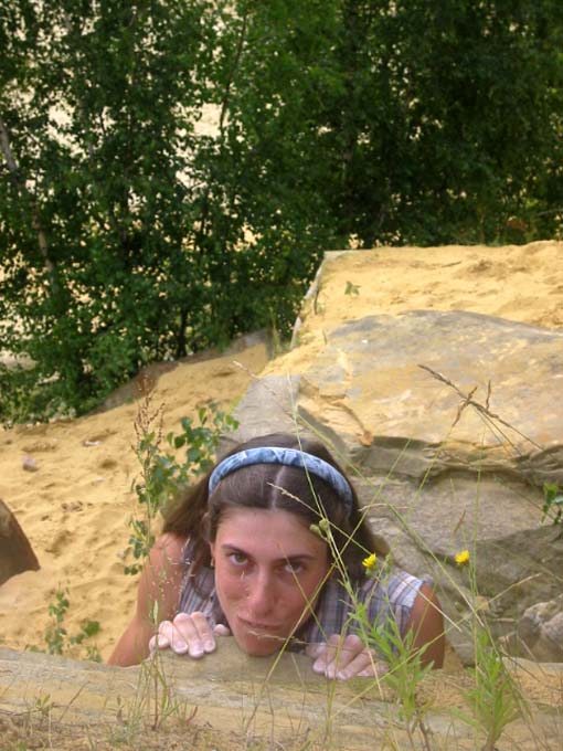 Весной этого года СБ показал нам несколько интересных камушков в Лыткаринских карьерах, в результате чего родилась идея написать этот юмористический материал. По более зрелому размышлению я пришла к мысли, что зря так огульно раскритиковала то, что предоставила нам не очень щедрая подмосковная природа. Мы вновь поехали в Лыткаринские карьеры летом и с интересом обнаружили, что, несмотря на столь небольшую высоту (от силы метра три - три с половиной), камушки вполне пригодны для траверсов и даже для нескольких довольно интересных болдерингов. В отличии от карьеров, камушки не крошатся, большие и удобные зацепки не имеют обыкновения оставаться в руках, а имеющиеся нависания предоставляют простор для фантазии. Внизу находится песок, так что падения относительно безопасны. Напротив камушков имеются шикарные (не особо загрязненные) пруды с пляжем. Следует быть аккуратными в плане осколков, но, учитывая близость к Москве, пруды просто замечательные.