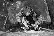 где скалы как правило покрыты слоем мха и прошлогодней хвои. Сначала скала очищается металлическими щётками,