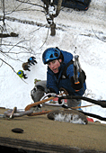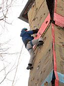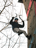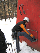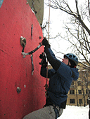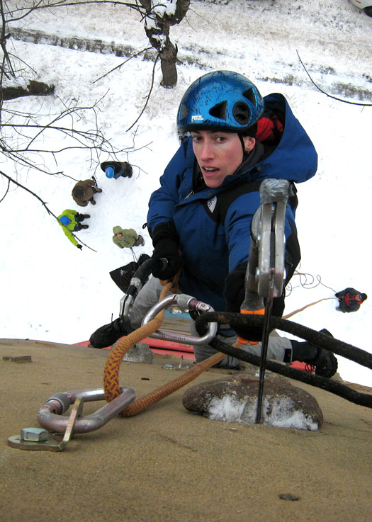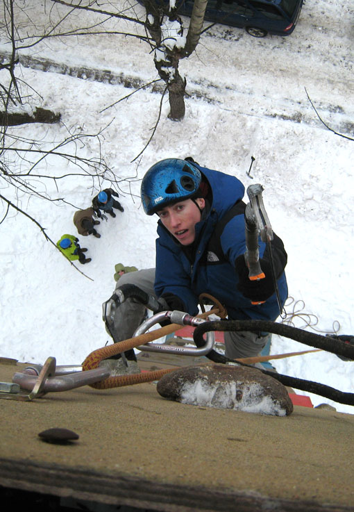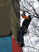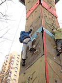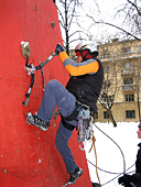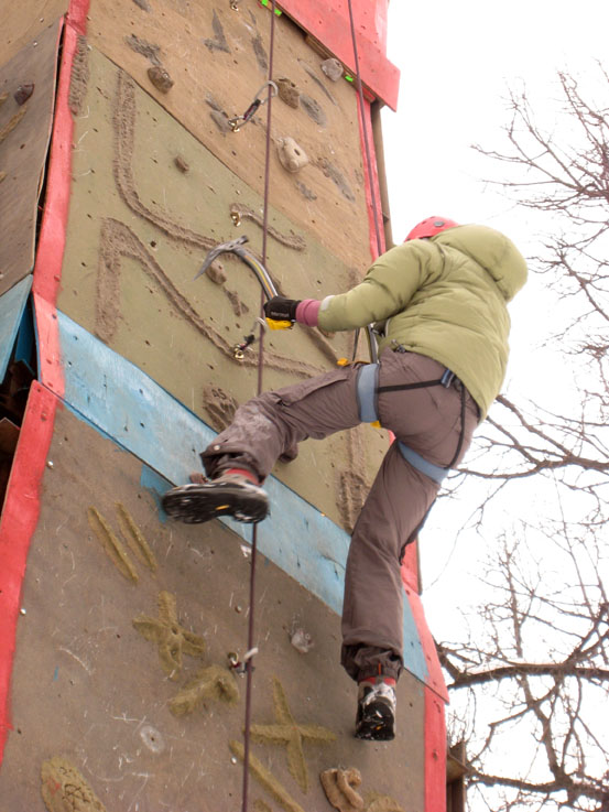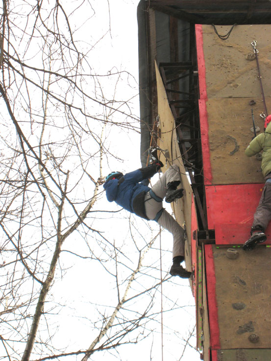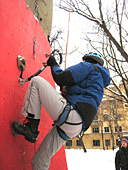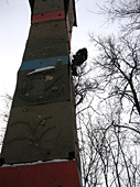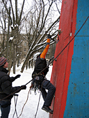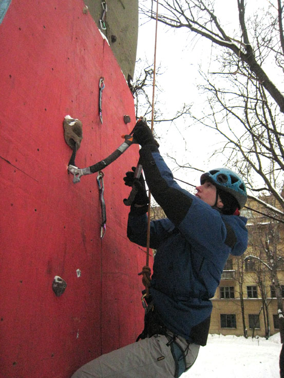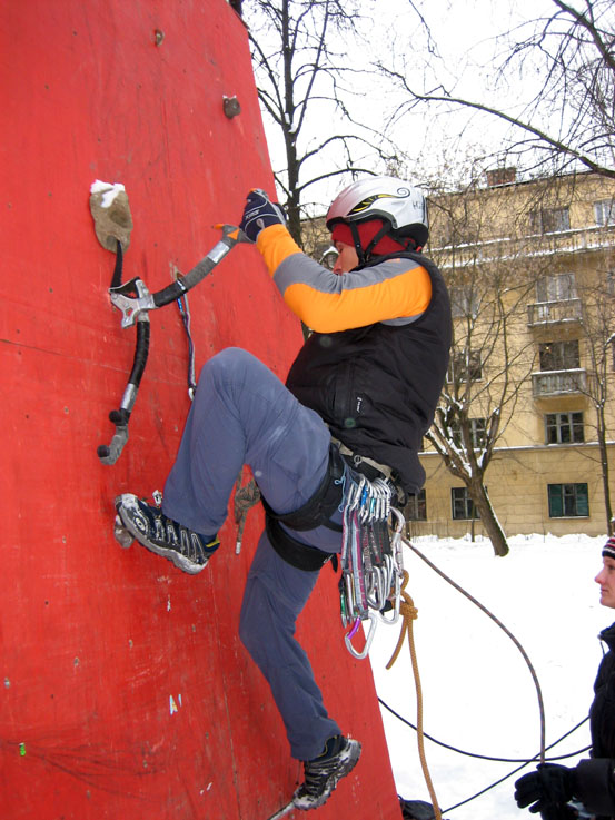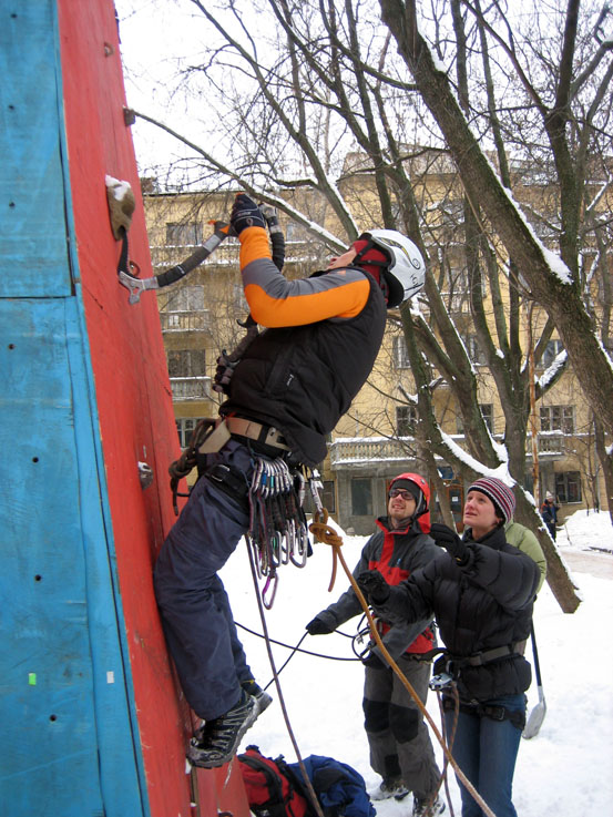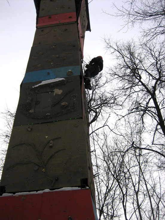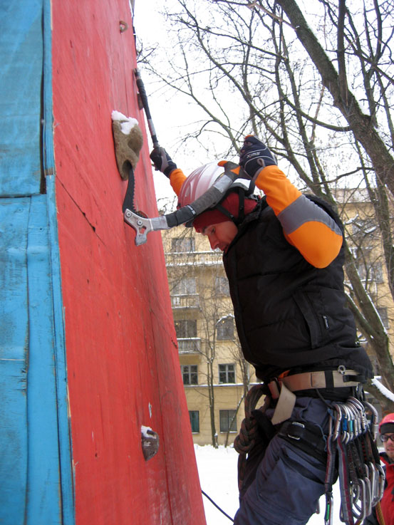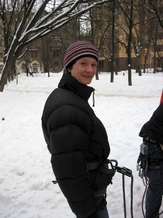 Температура на улице была градусов 5-7 мороза, когда мы высыпали из Пашиной машины и подошли к башне. Пока выгружали снаряжение и натягивали обвязки, подвалил еще народ. Мне технично предложили провесить трассу с нижней, я технично отказалась (сказав, правда, что в принципе не против ее провесить, но без тяпок). Паша мужественно полез вешать нам трассу. Потом мы лазили, и за это время я успела узнать много ценных вещей: