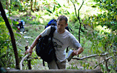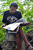 Должен заметить, что в купленном в Kuala Lumpur гайде, района Bukit Keteri не было, и вообще тех районов, которые пробивал Mammut под Дэвида Ламу, там не обнаруживалось. Это вселяет надежду что в Малайзии все таки есть районы помимо Bukit Keteri в которых много семерочного, восьмерочного лазанья. Ориентироваться в секторе нам предстояло по Тайскому гайду. Сразу обнаружилось что для большинства сложных маршрутов у нас не хватит веревки, а те, на которые хватает, в основном сосредоточены на втором ярусе скал с очень сложным и опасным подходом. Попытка разведать проход на второй ярус, предпринятая мной без снаряжения, но зато в сандалях, выявила следующие особенности. Во-первых, залезть можно без особых проблем: сложность лазанья меньше 5, однако с определенного момента без веревки спуск будет крайне рискованным. Во-вторых, для исследования второго яруса лучше все-таки взять скальники, надеть обвязку, и захватить напарника с веревкой. Дело в том, что лазанье до второго яруса, хотя и идет по положилову с удобными зацепками, но попадаются места, где легко можно отломать здоровенный бульник и вместе с ним улететь вниз. В мои планы это решительно не входило, поэтому дойдя до определенного момента я ретировался и спустился вниз. В третьих, на все на это требуется гораздо больше времени, чем мы с Олегом располагали, и было решено лазить то, что есть.