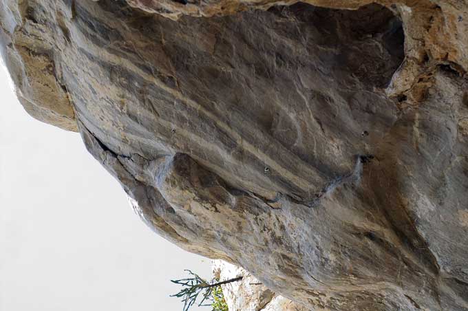 Дальше справа налево идет Project, 7c, 6b. Размяться было решено на 6с, дальше вылезти 7а и попробовать 7с. Но тут в дело вмешался случай, не сумев разглядеть замаскированный в скале шлямбур с 6с, мы смело ринулись на 7а (не зная об этом). Мне совершенно не хотелось лезть и прощелкивать оттяжки и право 6с онсайта я предоставил Олегу. Представьте себе моё удивление, когда с горем пополам вщелкнув вторую оттяжку, Олег вдруг на полном серьёзе заявляет: - “Держи!”. Ну думаю, это он переволновался, сейчас повесит и зарубит, ага!, не тут-то было. Три безуспешные попытки с красивыми полетами - и право первопрохода перешло ко мне.
