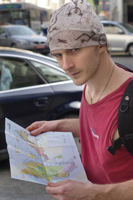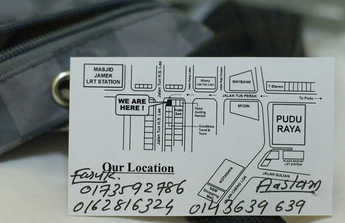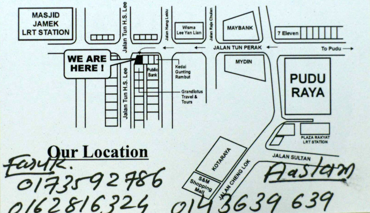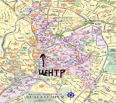 Центр Kuala Lumpur представляет собой пересечение всех железнодорожных и автобусных маршрутов, то есть отсюда можно выдвинуться в любую точку страны. Плюс к этому на трех этажах размещены рестораны, сувенирные лавки, информационные терминалы и ресепшены дорогих отелей. Вот на одном из таких ресепшенов мы и попытались снять двух местный номер, однако самый дешевый номер стоил 150 ринтгит =1500 ThB. (1$ = 3.2 ринтгит = 32 ThB.) Бюджетный вариант нам посоветовали искать в китайском квартале. Китайский квартал должен располагаться в районе станции метро Masjid Jamek (две остановки вверх от центра по синей ветке), но мы нашли там только Индийский квартал и соответственно индийскую гостиницу. По ценам в той гостинице разброс от 30 до 80 ринтгит, в зависимости от наличия кондиционера и санузла в различных вариантах. (Схема проезда к гостинице)