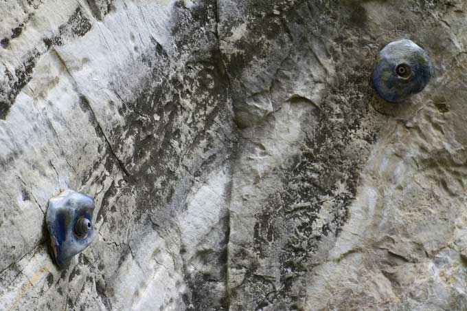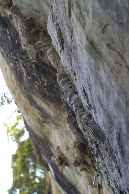 Размялись на 6б. Основной проблемой на ней для меня было солнце, которое сразу после того как Олег её повесил, осветило склон. А для лазанья на выбор поблизости были следующие маршруты: 7a+, 7b+ по положилову, 8с+, 7с+ по нависанию. Лазить положилово Олег наотрез отказался, поэтому выбрали 7с+. Ну, по сложившийся у нас в этот выезд традиции, пока Олег висел на четвертой оттяжке, раздумывая, как же лезть эту жопу, я, к своему удовольствию, после второго шлямбура обнаружил дорожку, уходящую направо. Олег висел перед ключом 8с+. Слезать с маршрута, узнав его категорию, Олег наотрез отказался (РЕСПЕКТ) и героически вылез ключ, применив секретную технику ИТО. Сложность лазанья до ключа мы определили как 6с после 7а+. Но засады на том не закончились. После того, как вщелкиваешь предпоследнюю оттяжку, чтобы определить дальнейшее направление движения, необходимо поднять голову наверх. Перед взором предстает следующая картина: прямо перед тобой каменный пупырь, на нем вне пределов досягаемости - шлямбур, поворачиваем голову налево - ничего воодушевляющего не видим, поворачиваем голову направо - видим пассивную, но удобную полку, а самое главное, если на нее ногами встать, окажешься на положилове. Так вот, направо идти ни в коем случае не надо! Встав на полку ногами, осознаёшь, что шлямбур остался внизу слева и дотянуться до него нет никакой возможности, что последняя точка страховки находится в трех с половиной метрах внизу под тобой и что до станции еще грести и грести. Добавим к этому, что спуститься вниз можно только спрыгнув, семь метров свободного падения гарантировано, что до станции работа предстоит по крошащемуся рельефу (я камушек килограмм на десять отковырял) и что стоять и материться на этой полке можно сколь угодно долго, положилово. Одним словом идти надо налево. Тогда спокойно снизу с активной зацепы вшелкиваем последний перед станцией шлямбур, прямо над головой, высоко, находим удобную дырочку под два пальца, снизу ее правда не видно и спокойно вылезаем к станции. В этот день Олег опробовал способ прохождения трассы справа. Я полазить не успел из-за солнца. Тут обнаружилась еще одна засада. Станция представляла собой три рядом расположенных шлямбура и все, ни кольца, ни хотя бы веревочки не было, посему проблему снятия оттяжек решили отложить на следующий день.