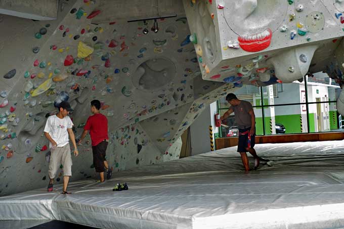 Тренажер расположен на пятом этаже огромного торгового центра. Представьте себе наше разочарование, когда проехав через весь город и вдоволь наискавшись в дебрях ТЦ скалолазный магазин и тренажер, мы оказались перед закрытыми дверьми. На дверях красовались часы работы и все говорило нам о том, что до закрытия тренажера ещё как минимум два с половиной часа. Наше недоумение развеял местный житель и по совместительству скалолаз Азман - оказалось, что по выходным и праздникам тренажер закрывается на четыре часа раньше. Так вот как раз в этот день индийская община Малайзии отмечала како-то свой праздник. Разговорившись с Азманом и рассказав о цели нашего визита в Малайзию мы обрели в его лице гида с личным транспортом на весь следующий день всего за 60 ринтгит с носа :)