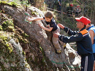 Стоя в очереди на трассу Т6 "Маятник", я наблюдал прохождение "Экстремальной" трассы одной из связок. На этой, самой сложной, трассе С4 надо было подняться до перильной веревки по сложному маршруту (не ниже 7а по трудности), перейти на перильную веревку, раскачавшись на ней "поймать" скалу в районе маршрута "камин" и , после сбора участников, вылезти наверх. Лидеру связки не удалось добраться до "камина" и он, раскачавшись, перебрался на березу, чтобы оттолкнуться от нее. На березе сидел фотограф, снимавший соревнования. В гуле всеобщего ликования раздались крики: "Хватай фотографа за ногу". Фотограф испугался и стал карабкаться выше по березе. Дальнейшую судьбу этой связки заслонил от меня уступ скалы.