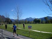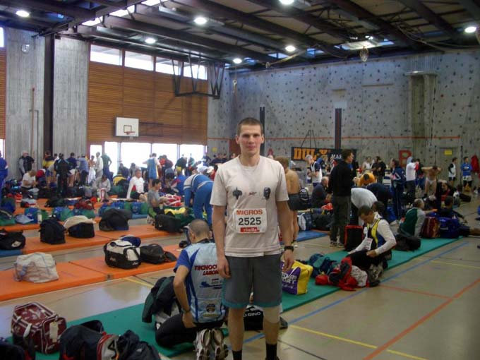 К 8.30 утра температура воздуха медленно но верно побиралась к 10°С. Ярко светило солнце, дул свежий ветерок, вдали виднелись снежные швейцарские Альпы - красота! В зале для переодевания был обнаружен ещё один скалолазный стенд - ровный, без нависаний, высотой 10м, зато длиной порядка 30м :) Оставшиеся до старта 20 минут были потрачены на лёгкую разминку и в 9.05 мы уже стояли на старте, радостно предвкушая предстоящее «развлечение».