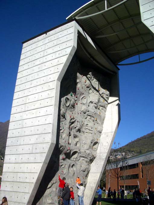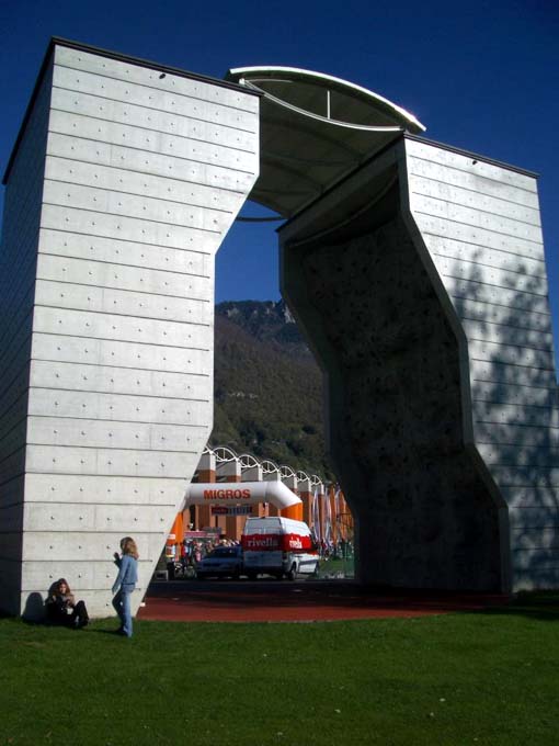 Марафон был организован в каком то местном спорткоплексе за городом (рядом с Локарно). Несколько спортзалов, футбольные поля, скалодром... стоп! СКАЛОДРОМ! Очень неплохой - 2 рельефные стенки с небольшим нависанием, соединенные крышей. Маршруты не подписаны, но на вид не самые простые. С веревкой и комплектом оттяжек можно лазать в любое время года (это почти Италия!).