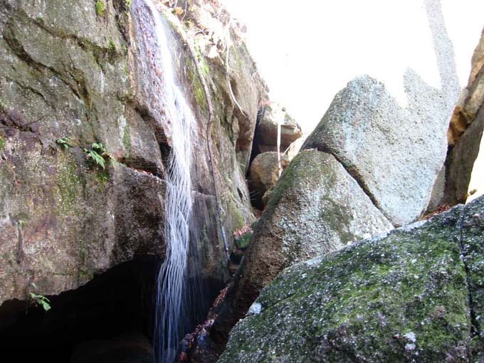 Весь парк – лабиринт из узких щелей между скалами из песчанника и плотного галечника. Маршрутов всего на пол-мили, но проходят они по местам под названиями Squeeze, Devil’s Ice Box, Devil’s Hole и Fat Man’s PerilТрейлы промечены плохо. Пару раз залезали не в ту степь. Ищем водопад Cascade Falls. Вроде по ощущению он должен быть в той стороне. Идем по каньону, дорогу преграждает завал из камней. Перебираемся через него, выходим из каньона над водопадом. Смотрим вниз – а трейл-то там – деревянные подмостки и смотровая площадка.