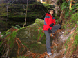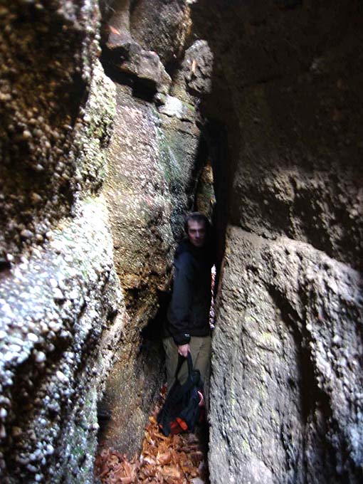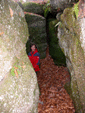 Ищем путь вниз. Мне показалось, что вот эта боковая щель нас выведет. Лена говорит: «Не лезь туда! Глубоко!» «Я только посмотрю…» Враспорку слез по щели, там пещера и откуда-то свет. Кричу: «Слезай сюда, тут выход!» Лена смотрит сверху, потом начинает спускаться. У выхода из пещеры встречаем мамашу с детьми. Потом выходим по трейлу к смотровой площадке.