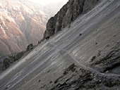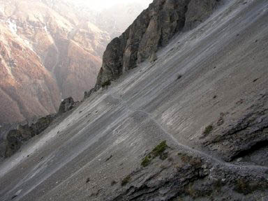 Ладно, лучше расскажу о страшном. Раз, перейдя через висячий мост над бурной рекой Марсьянгди, мы любовались каменными арками и водопадами. Но дело к вечеру, я обратила внимание на небольшую площадку пониже тропы, где можно было поставить палатку. Вокруг - много пещер, и мы гадали, живет ли там кто-нибудь, и если да, то кто. И, как водится, заросли чудо-травы по колено.