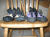 На Лисбоновских слабах начал я грешить на свои сношенные до дыр скальники. В конце-концов решился и отправил две пары в переклейку. После долгого исследования кто лучше переклеивает, отправил две пары в Калифорнию к Yosemite Bum. Эта та же контора, которая делает тапки Evolv. С какого то момента они стали переклеивать только своей резиной, считая что она самая лучшая. Заняло это 9 дней и $86 за две пары, включая пересылку. Сделали они все очень качественно. Резина липнет не хуже файвтеновской, но живет явно дольше. После семи дней лазания края подошв еще остренькие.