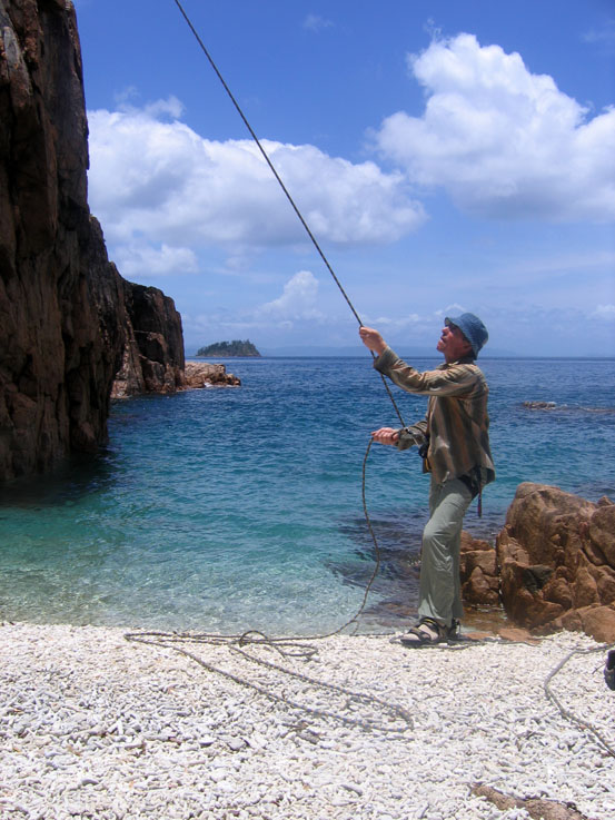 Одна из восхитивших меня особенностей скалодрома заключалась в том, что наряду с обычными оттяжками для нижней страховки есть дорожки с крюками, не крючьями в традиционном альпинистском понимании, а крюками типа «свиных хвостиков». Дорожки с крюками сделаны на нависаниях и потолках. В конце дорожки – все тот же блок с заведенной в него страховочной веревкой. С помощью длиннющего шеста (см. фото) инструктор виртуозно набрасывает на эти крюки веревку и спокойно уходит пить чай. Потому что знает – никто ни во что не грохнется! Никто ни за что не упадет!