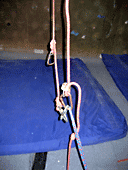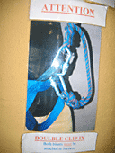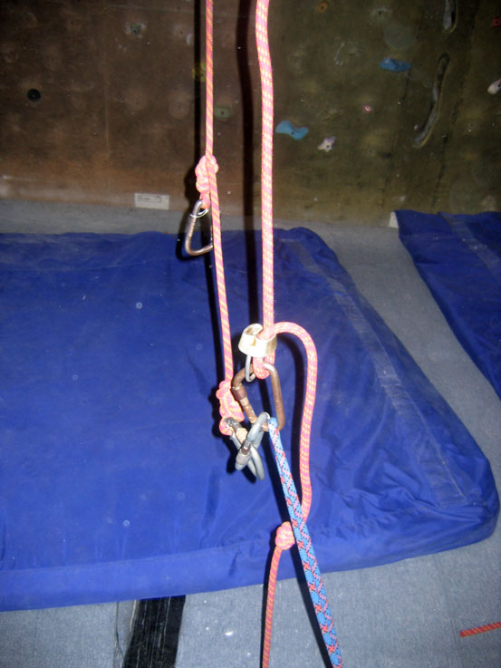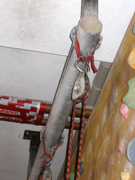 Очень своеобразная система верхней страховки. На конце, к которому прищелкивается лезущий, два узла. В каждом по карабину. Оба карабина необходимо вщелкивать в беседку. Страхующий прищелкивается карабином к метровой веревке, закрепленной в полу (как гри-гри в ддс). На втором карабине, прищелкнутом к этой же веревке – страховочный элемент ATC .