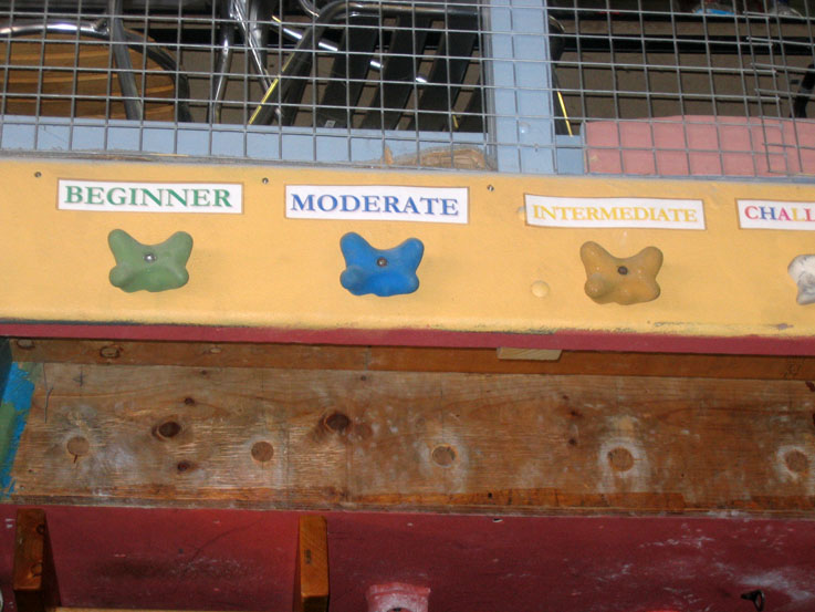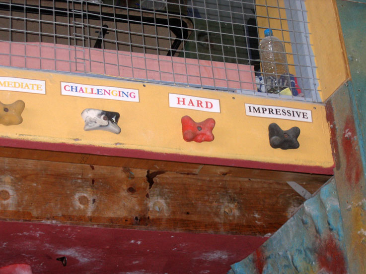 Примечательная особенность скалодрома - это дифференциация всех маршрутов по цветам. Самый легкий beginner – зеленый. Синий - moderate сложнее. Желтый – intermediate. Пятнистый – challenging. Красный – hard. И, наконец, черный - impressive. Согласно словарю – производящий глубокое впечатление, волнующий.