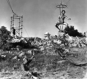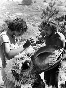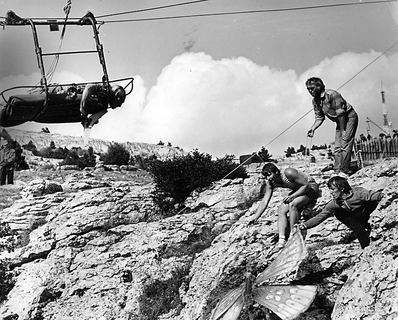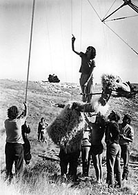 Ввиду того, что камера стояла сбоку и немного выше меня, я решил, что не будет большого криминала, если я проковыряю маленькую дырочку в задней части птичьего брюха. Тем более, что географически она совпадала с реальным отверстием реального птенца птицы Рок. И я сделал дырку. Это было маленькое, величиной с нынешнюю десятикопеечную монету отверстие, но я обрел визуальный контакт с почвой! Я увидел землю! Это была радость мореплавателя, дожевавшего последние сапоги и отчаявшегося сойти на берег! Мои прыжки стали осмысленными! И хотя визуальный контакт с почвой осуществлялся через задницу, я себя в ней уже не чувствовал! Съемки продолжаются!