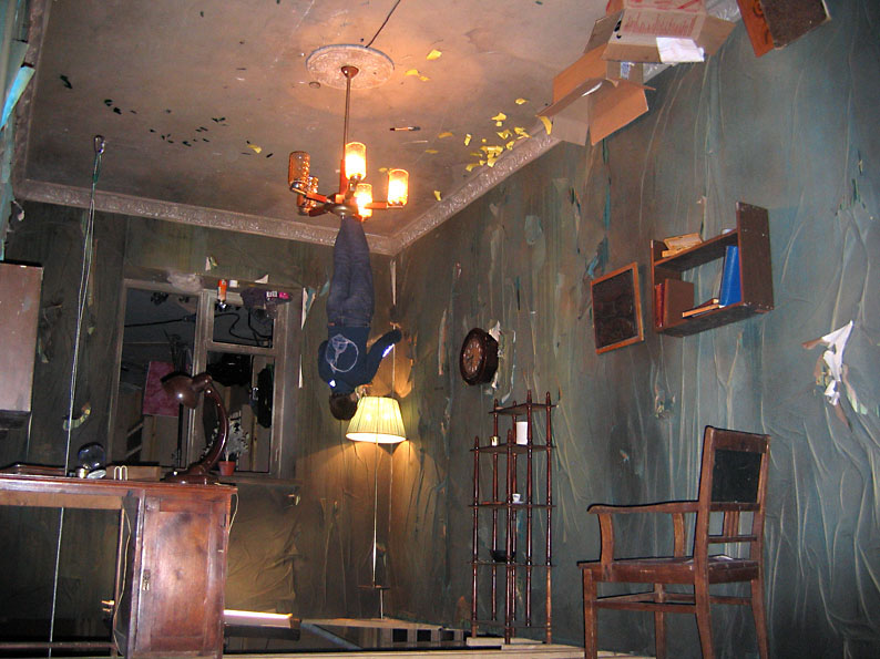 Декорация, в которой происходили съемки, называлась «перевернутая комната». И потолок в ней, естественно, был на полу. На нем (на полу, изображавшем потолок) одиноко стояла люстра, развесившая три унылых плафона. А с потолка свисал письменный стол с прибитым к нему календарем, книжкой и настольной лампой. В дальнем углу комнаты вниз головой свисал торшер. И завершало все это мебельное убранство интеллектуальное достояние квартиры – книжные полки, со свисающими вниз головами книгами. Полки и книги были покрыты паутиной. Впрочем, также как и остальная мебель.
