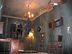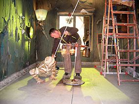 Пристегнув тросики к поясу, я поднялся по внешней стороне декорации на «пол», который как таковой отсутствовал и, перегнувшись вниз головой, начал стекать вниз по стене. Начались поиски пластического решения.