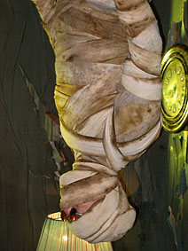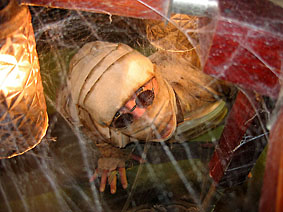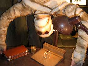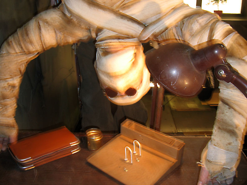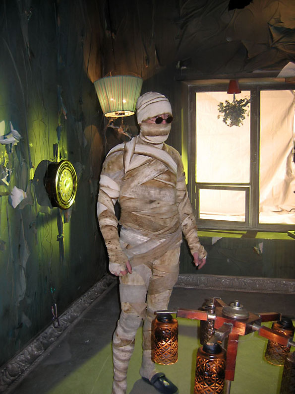 Когда я достиг полного сходства с ожившей мумией, извлеченной из гробницы, и решил, что пора бы и поработать, мне сказали - щаз! Мы вот только подвесим то и закрепим это. Подвесили. Закрепили. Всего лишь за час. Потом два часа выставляли свет. Чтобы избавиться от смутного беспокойства, закрадывающегося в мой забинтованный организм, и, хоть чем-нибудь себя занять я , время от времени, подтыкая кончики вылезших бинтов из трупного костюма, ходил по пыльному павильону в поисках подходящей гробницы для покойного времяпровождения. Ничего достойного внимания кроме фрагмента космического корабля не нашлось. Но улететь на нем не представлялось возможным. Я смирился и продолжил ожидание.